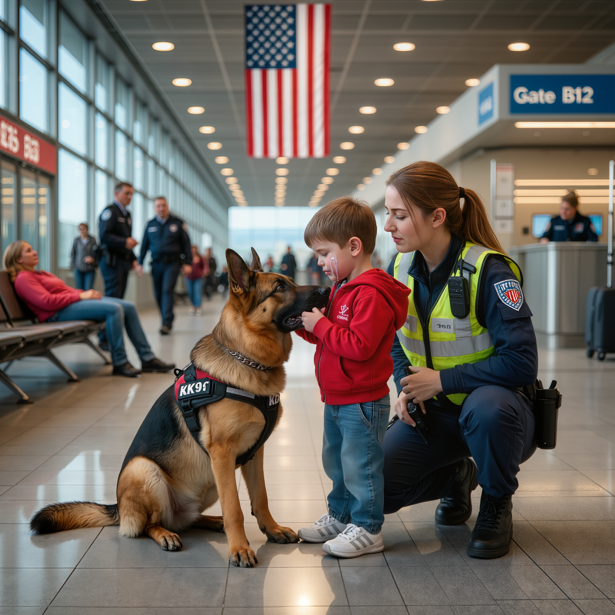 It was one of those quiet Sunday mornings where the airport felt less like a hub of movement and more like a museum waiting to wake up. The fluorescent lights buzzed overhead while the distant sound of suitcase wheels echoed through near-empty corridors. Officer Janet Monroe adjusted her patrol belt and gave a casual nod to the security guards at checkpoint C before turning to her partner, Max, who walked dutifully by her side. Max, a seven-year-old German Shepherd with eyes sharp as flint and a loyalty unmatched, padded silently along the tiled floor. Unlike most K9s, Max wasn’t particularly fond of children or crowds—but he was damn good at his job. Their patrol was routine, unremarkable, and Janet was half-hoping the shift would remain that way. But as they rounded a corner near Gate 12, the sound of a child crying shattered the stillness like a dropped pane of glass.