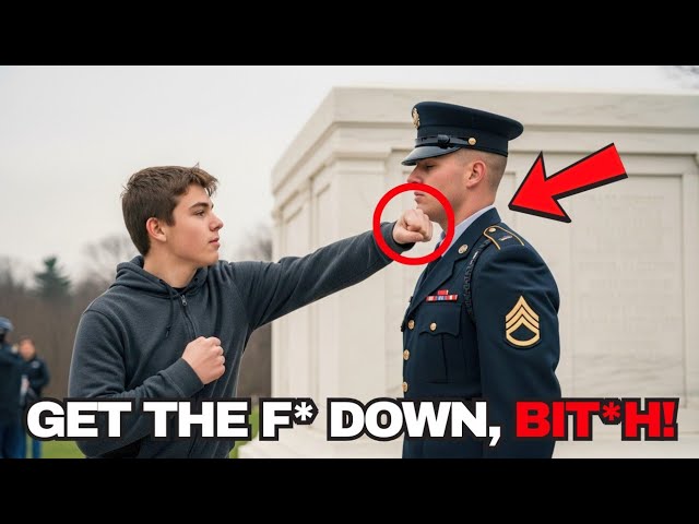 The bully strutted forward, his arrogance dripping with every step. Friends egged him on, laughing, their phones out to capture the “prank.” Without hesitation, he swung his fist, landing a punch on the guard’s shoulder as if daring him to react. The crowd gasped — a horrified wave of sound that rolled across the memorial.