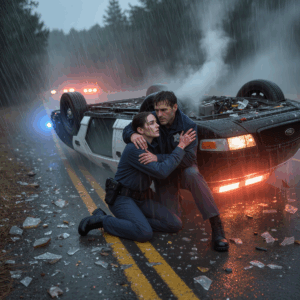 He grabs a flashlight and steps into the rain. Up close, the wreckage is worse. The car flipped at least twice. Broken glass everywhere. The driver’s door is crushed. Slumped against the steering wheel is a young woman in uniform. Her badge catches his light.