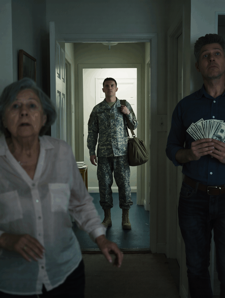 My husband stood there in full uniform, his duffel bag still slung across his shoulder, his cap tucked under one arm. His face, for one breathtaking heartbeat, was pure joy — he had come home early, ready to surprise me. But as his eyes swept across the scene, as he took in his mother’s raised hand, Monica’s sneer, Brett’s fist full of cash, that joy burned away.