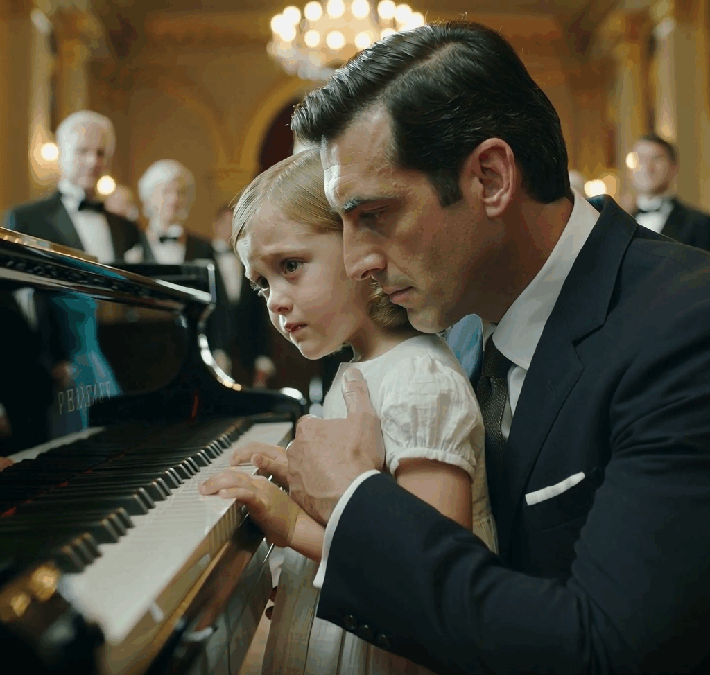 The ballroom was filled with laughter, golden chandeliers throwing glittering light across marble floors. In one corner stood a little girl, small and fragile, her hands trembling over the polished keys of a grand piano. Her clothes were plain, her shoes scuffed, yet her eyes carried a quiet determination that seemed to pierce through the grandeur around her.