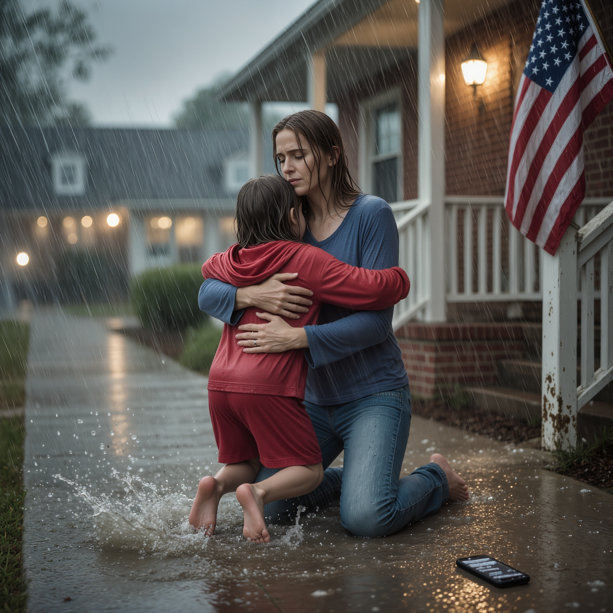 Someone’s porch light flicked on across the street. A car slowed as it passed. Somewhere, a neighbor’s television glowed blue against a living-room wall. But no one came out. No one interrupted the quiet disaster happening in front of the small brick house with the sagging flag and the flowerpots now overflowing with muddy water.