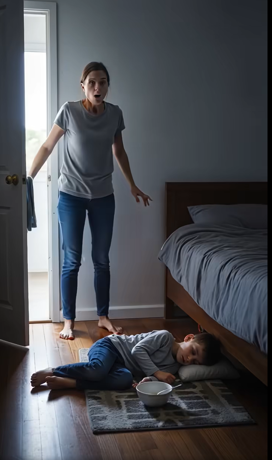 He was curled on the floor beside an overturned bowl, lips cracked, cheeks hollow, eyes sunken in ways no child’s should be. His breath was shallow, wheezing through dry lips.