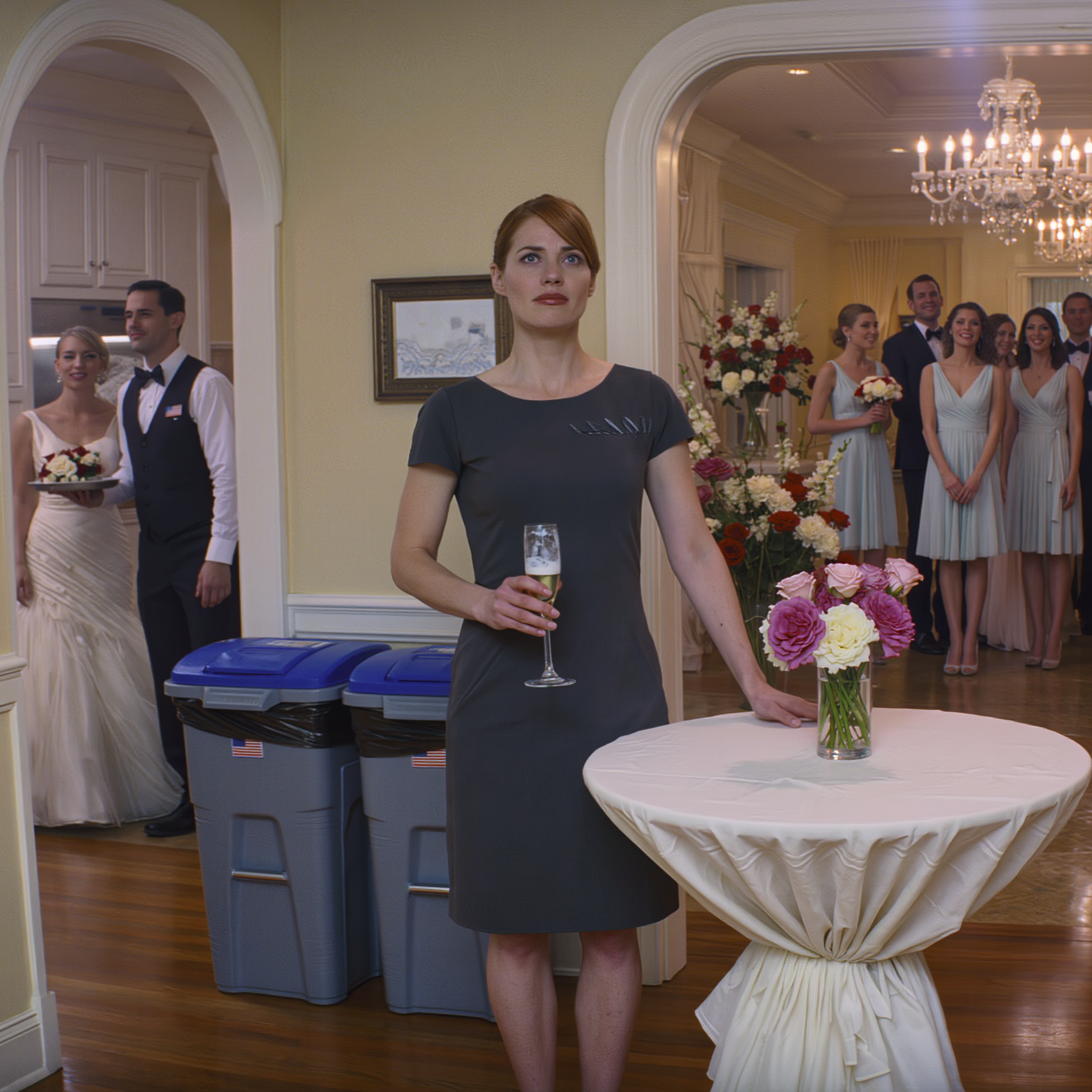 My assigned table was positioned directly across from the service entrance where catering staff rushed back and forth with trays. Next to it sat three large trash bins with black plastic bags hanging over the sides.